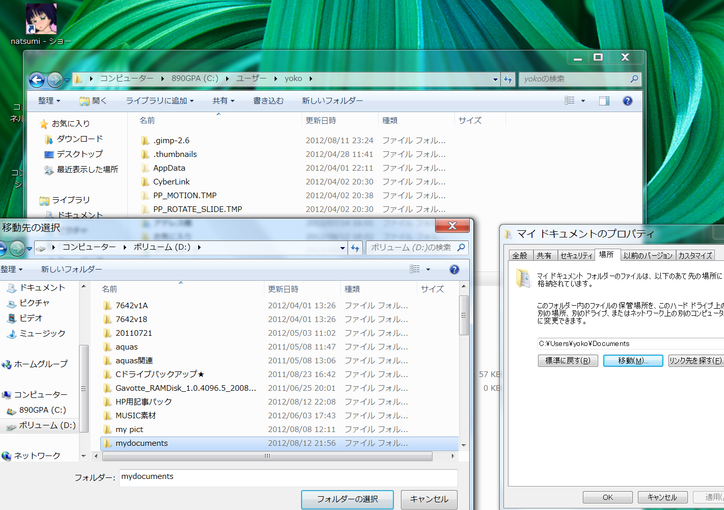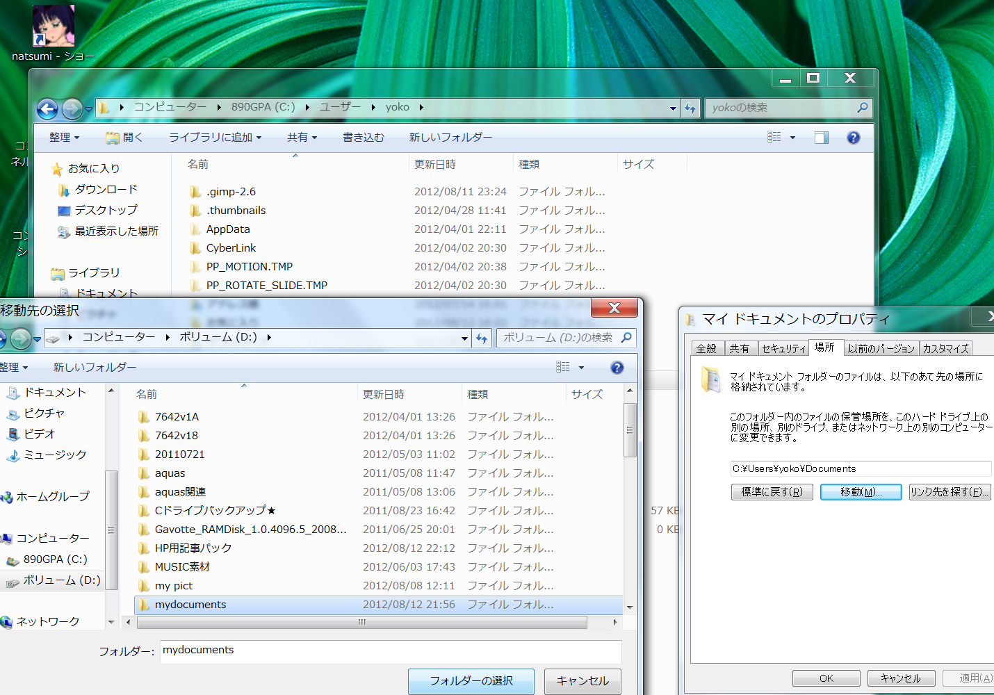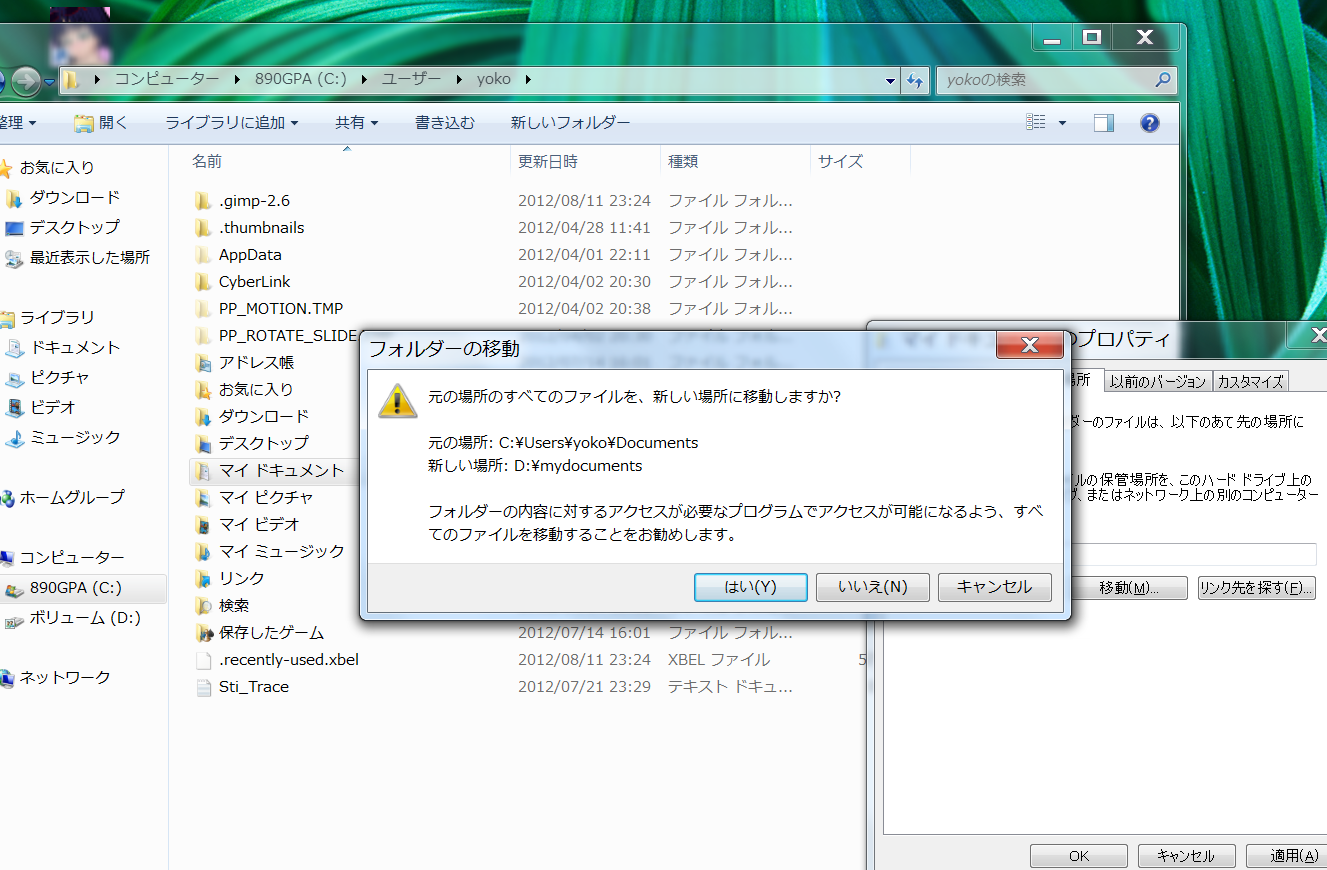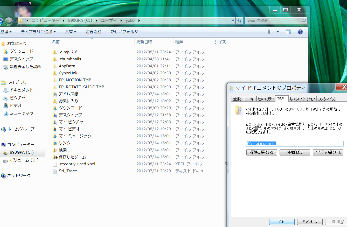 新たな移動先はDドライブの中のmydocumentsです。